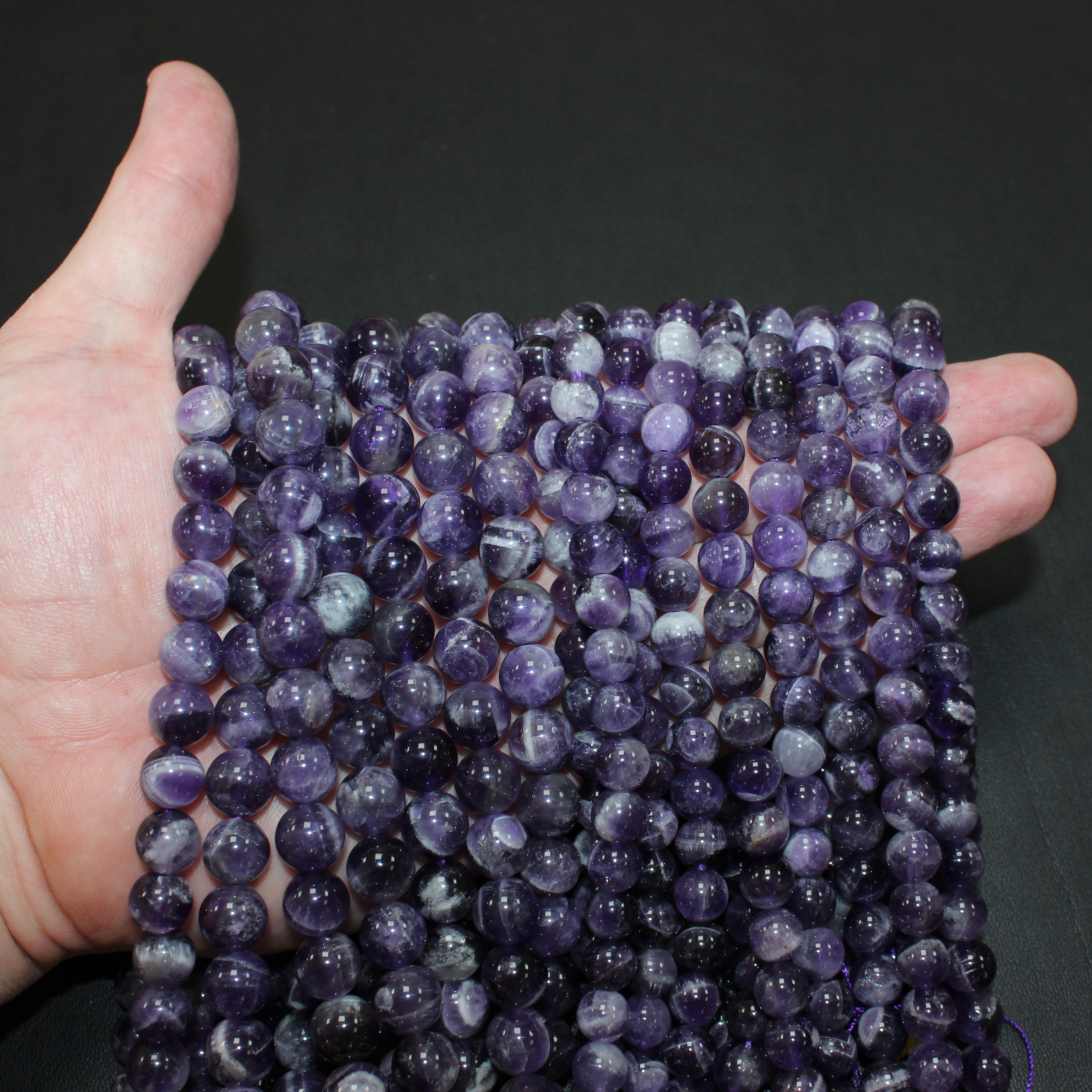 8мм - примерное количество бусин в нити 47шт, вес 37гр, отверстие примерно 1мм